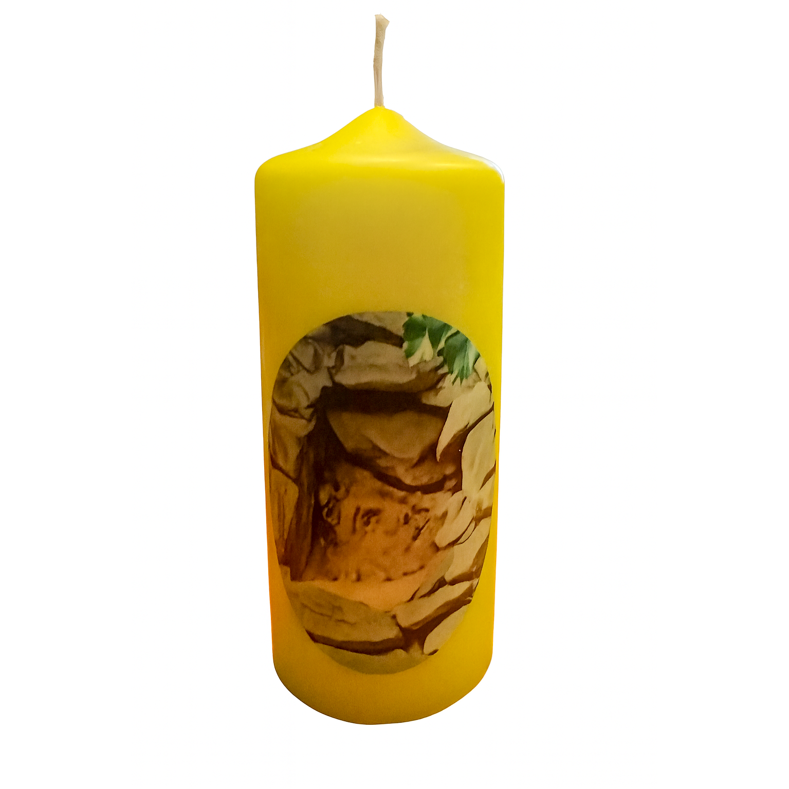 Diese Kerze trägt sein Gesicht so, wie er sich in der Erscheinung der Grotte zeigte.